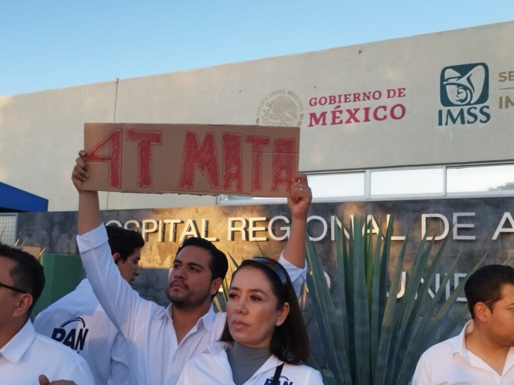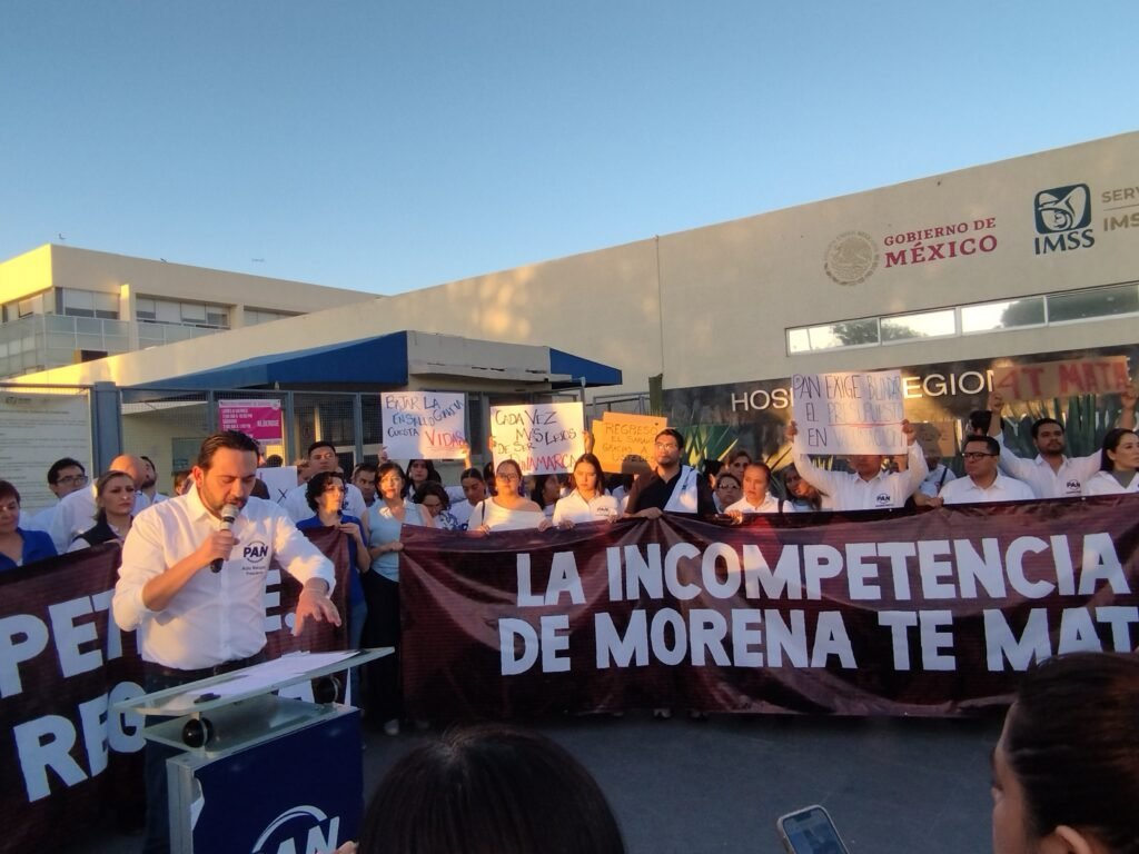 ‘Hoy venimos a manifestarnos de forma pacífica aquí afuera del Hospital de Alta Especialidad en la ciudad de León, un hospital que como ustedes saben ha tenido crisis, ha tenido mal servicio y que la federación, el gobierno de Morena ha dejado caer’, dijo el líder de los panistas.