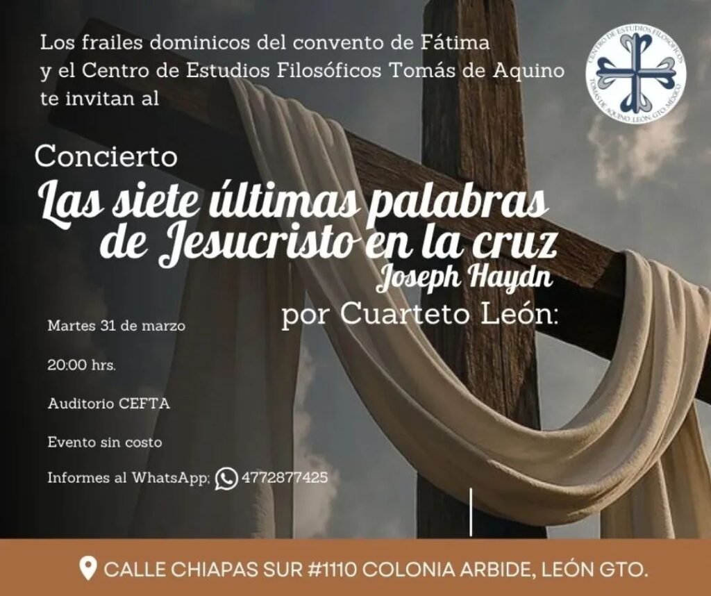 En un ambiente de recogimiento y profunda reflexión, el Cuarteto León ofreció un emotivo concierto la noche de ayer en el Convento de Fátima, recinto de los frailes dominicos en la ciudad de León, donde interpretaron la obra Las Siete Últimas Palabras de Cristo en la Cruz del compositor Joseph Haydn.