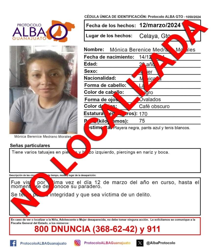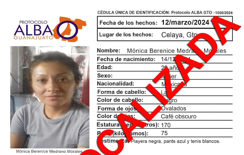 Por No Localizada, Protocolo Alba Guanajuato desactivó la ficha de búsqueda de la joven Mónica Berenice Medrano Morales desaparecida en la ciudad de Celaya.