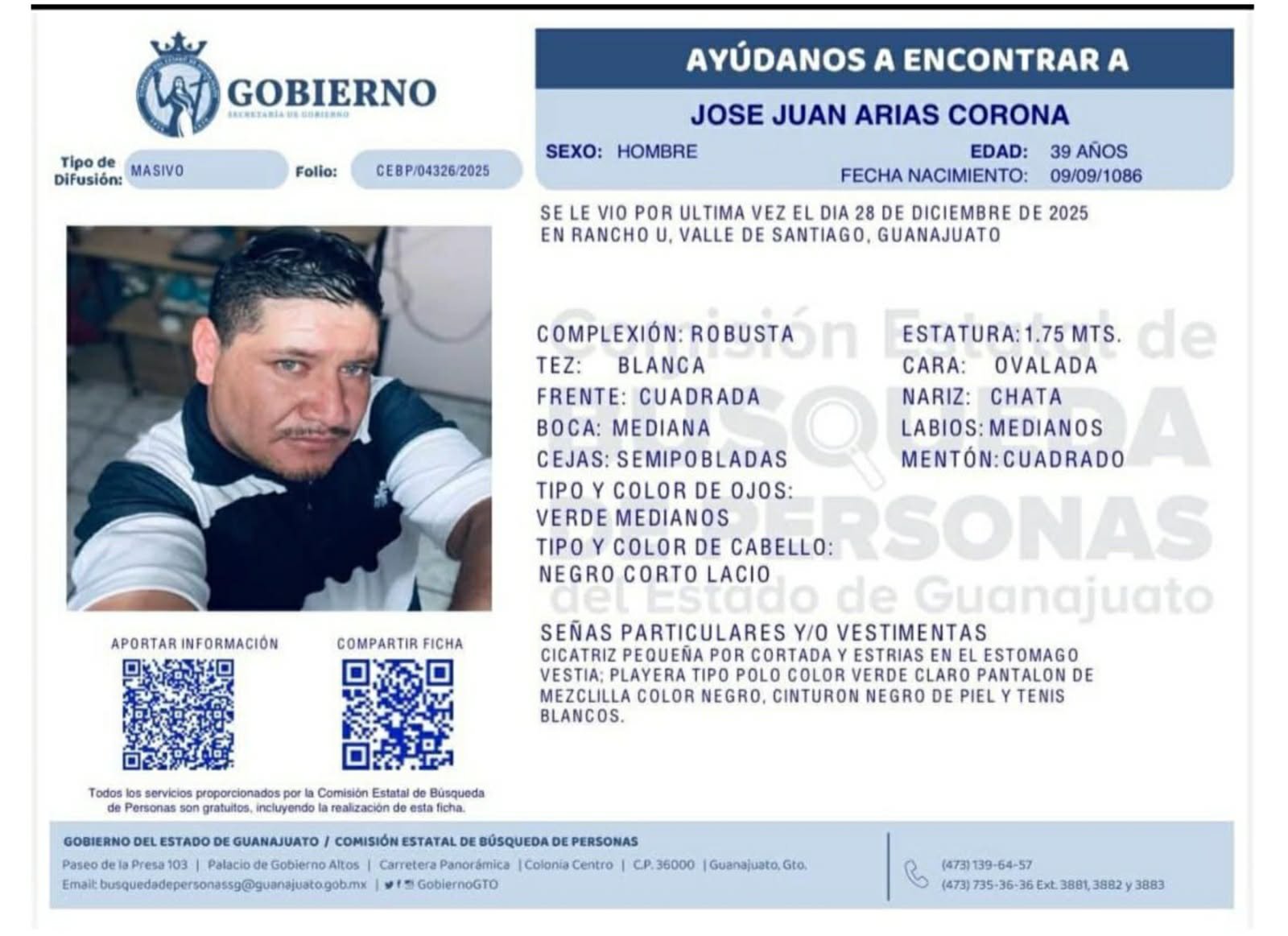 José Juan buscador de su hijo, fue visto la última vez el domingo 28 de diciembre a las 10:40 de la mañana tras dejar a su esposa en su trabajo, salió en una motocicleta color negra y no se supo más de él, por lo que la Comisión Estatal de Búsqueda de Personas emitió una Ficha de Búsqueda para dar con su paradero.