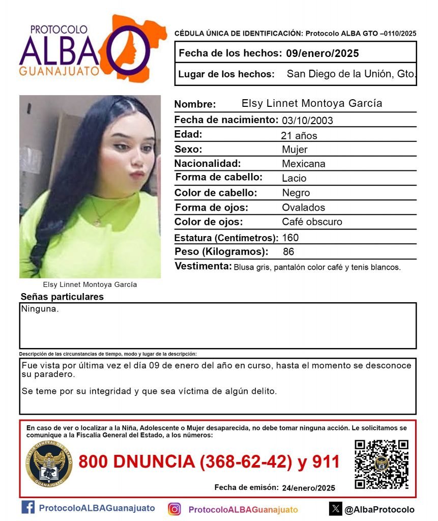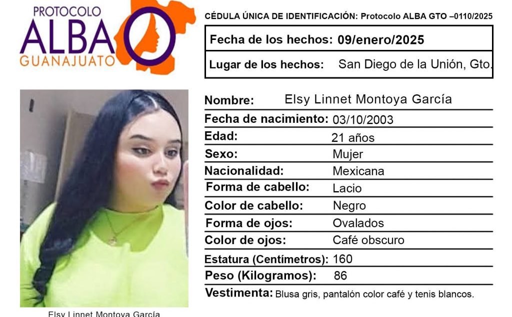 En San Diego de la Unión se reportó la desaparición de la jovencita Elsy Linnet Montoya García de 21 años de edad, originaria de la ciudad de Celaya, por lo que se activó el protocolo ALBA Guanajuato.