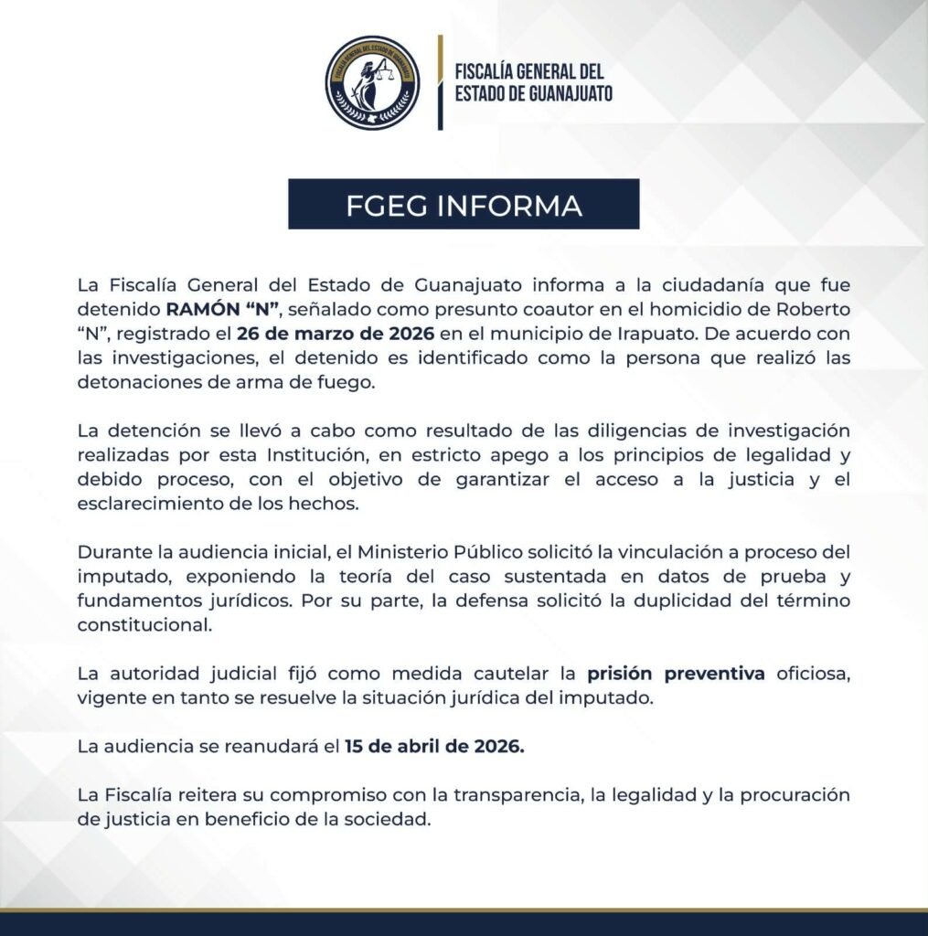 La Fiscalía General de Guanajuato informó que fue detenido Ramón ‘N’ como presunto coautor intelectual del homicidio del director de Japami e Irapuato, Roberto ‘N’