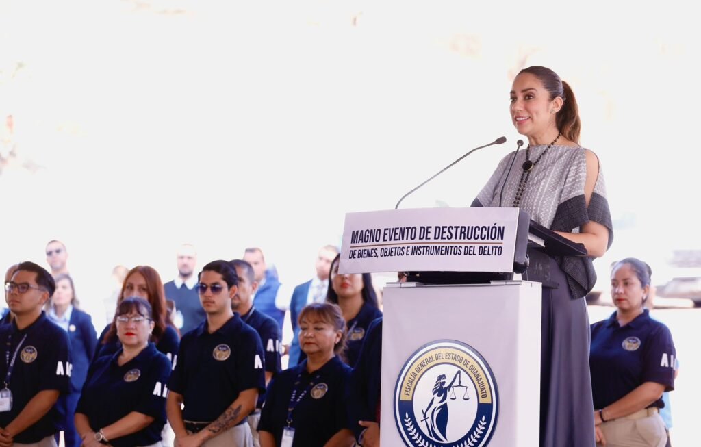 Con un llamado contundente a reforzar la seguridad y garantizar la tranquilidad de las familias, la gobernadora de Guanajuato, Libia Dennise García Muñoz Ledo, encabezó el Magno Evento de Destrucción de Bienes, Objetos e Instrumentos del Delito, organizado por la Fiscalía General del Estado.