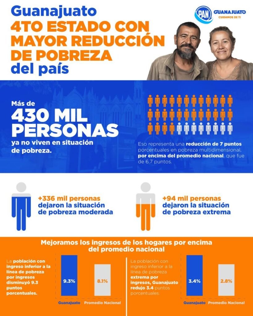Durante rueda de prensa en la que participó la dirigencia del Partido Acción Nacional en Guanajuato, Aldo Márquez y Juanita de la Cruz, así como legisladores federales, locales y representantes del partido a nivel nacional, el presidente Aldo Márquez precisó ante la opinión pública que gracias al trabajo integral que se ha generado por parte de los gobiernos de Acción Nacional en el estado, los índices de pobreza han disminuido en más porcentaje que incluso en la media nacional.