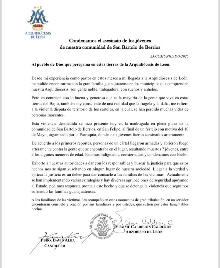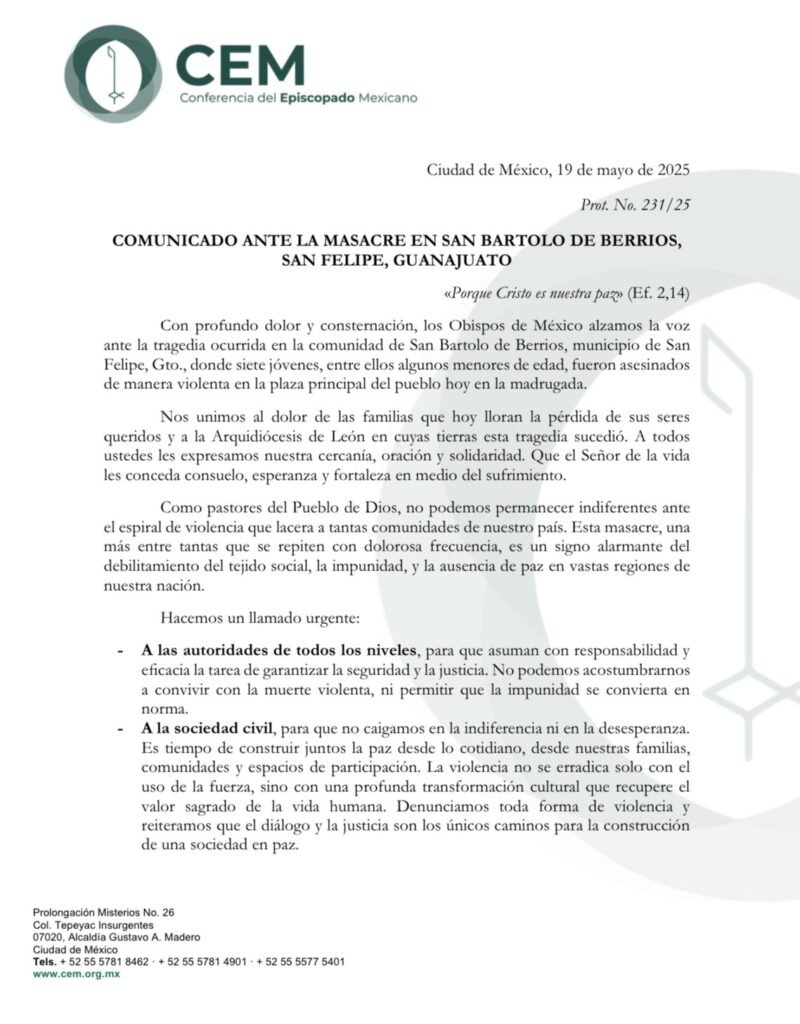 Por su parte la Conferencia del Episcopado Mexicano también emitió un comunicado que a la letra dice ‘Los obispos de México alzamos la voz ante la tragedia ocurrida en la comunidad de San Bartolo de Berrios, municipio de San Felipe, Guanajuato, donde siete jóvenes entre ellos algunos menores de edad fueron asesinados de manera violenta en la plaza principal del pueblo hoy en la madrugada’.