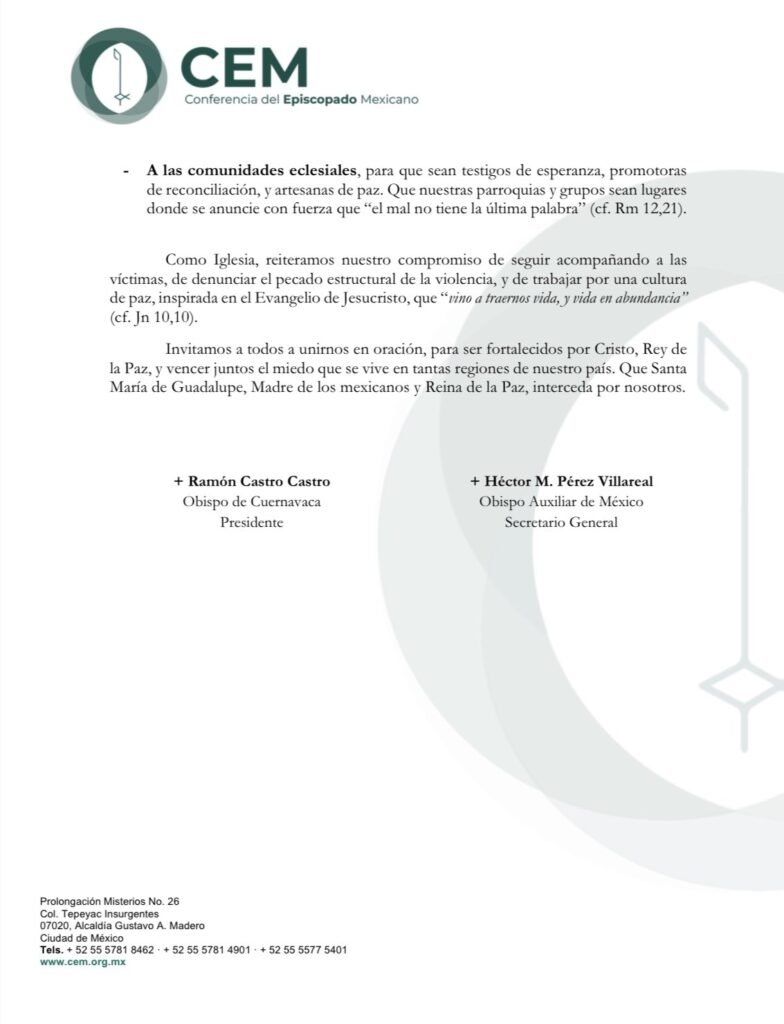 En el comunicado resalta también lo siguiente ‘Como pastores del pueblo de Dios, no podemos permanecer indiferentes ante el espiral de violencia que lacera a tantas comunidades de nuestro país. Esta masacre, una más entre tantas que se repiten con dolorosa frecuencia, es un signo alarmante del debilitamiento del tejido social, la impunidad, y la ausencia de paz en vastas regiones de nuestra nación’.