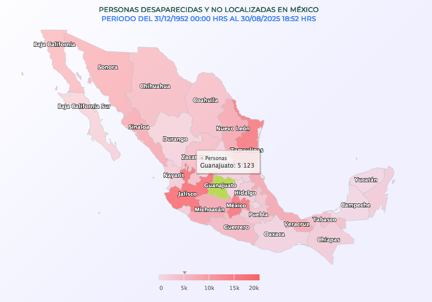De acuerdo con el Registro Nacional de Personas Desaparecidas y No Localizadas (RNPDNO), en Guanajuato se registran hasta el día de hoy 5,123 personas desaparecidas.