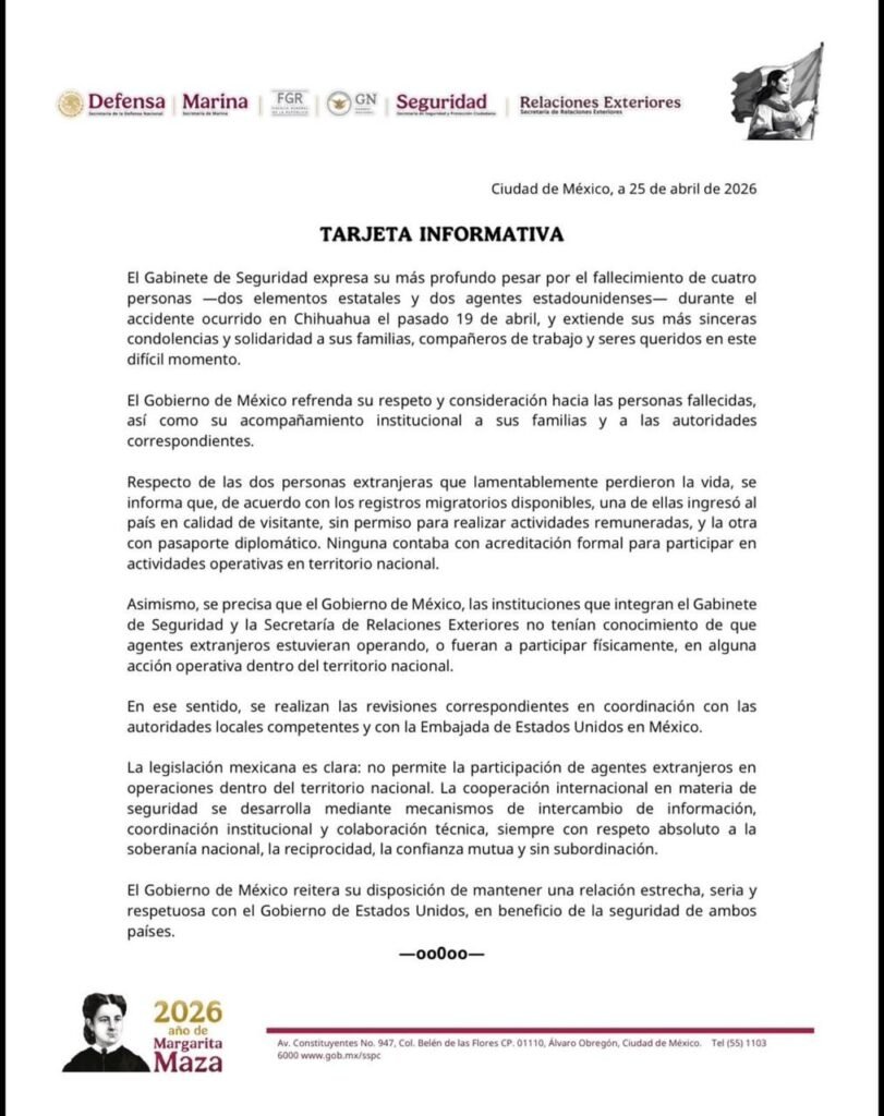 ‘La legislación mexicana es clara: no permite la participación de agentes extranjeros en operaciones dentro del territorio nacional. La cooperación internacional en materia de seguridad se desarrolla mediante mecanismos de intercambio de información, coordinación institucional y colaboración técnica, siempre con respeto absoluto a la soberanía nacional, la reciprocidad, la confianza mutua y sin subordinación’ dice comunicado compartido éste sábado 25 de abril del 2026.