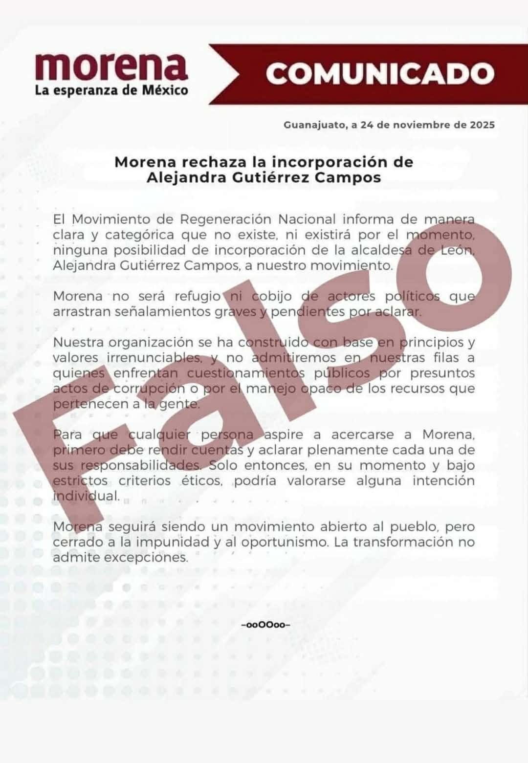 Tras las especulaciones de que la alcaldesa anunciaría su salida del PAN, el comunicado falso decía lo siguiente: ‘Morena informa que de manera clara y categórica que no existe, ni existirá por el momento ninguna posibilidad de incorporación de la alcaldesa de León a su movimiento’.