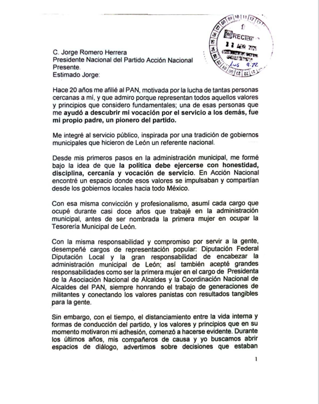 La alcaldesa de León, Alejandra Gutiérrez, anunció su renuncia al Partido Acción Nacional, PAN, tras asegurar que durante años fue objeto de “ataques sistemáticos desde el poder” y que el instituto político “se traicionó a sí mismo”. La edil sostuvo que, pese a sus señalamientos internos, “jamás fue escuchada”, lo que la llevó a tomar la decisión de separarse de las filas panistas.