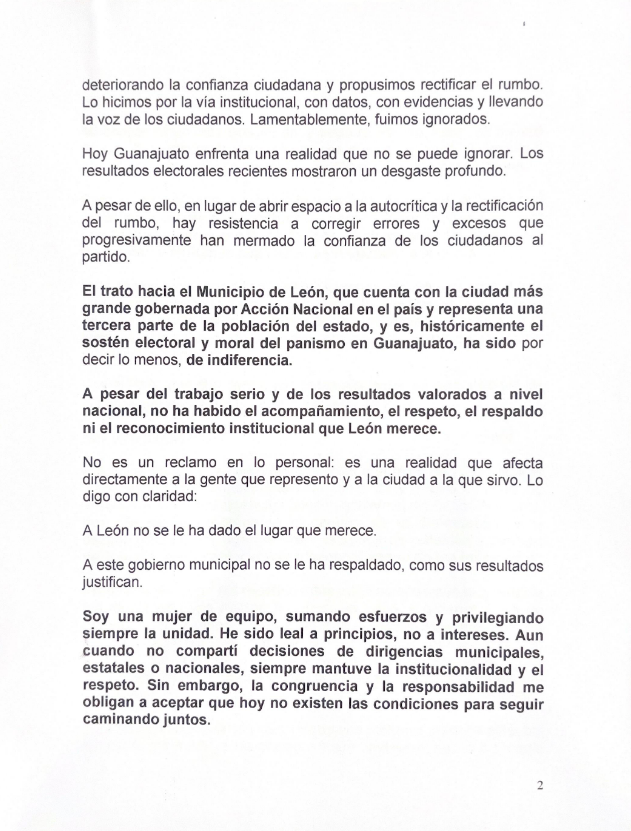 Por su parte, la gobernadora de Guanajuato, Libia Dennise García Muñoz Ledo, consideró que la controversia debe resolverse al interior del partido, al tratarse de un asunto de carácter político-partidista. No obstante, envió un mensaje a la ciudadanía leonesa al asegurar que su administración continuará enfocada en el desarrollo del municipio.
