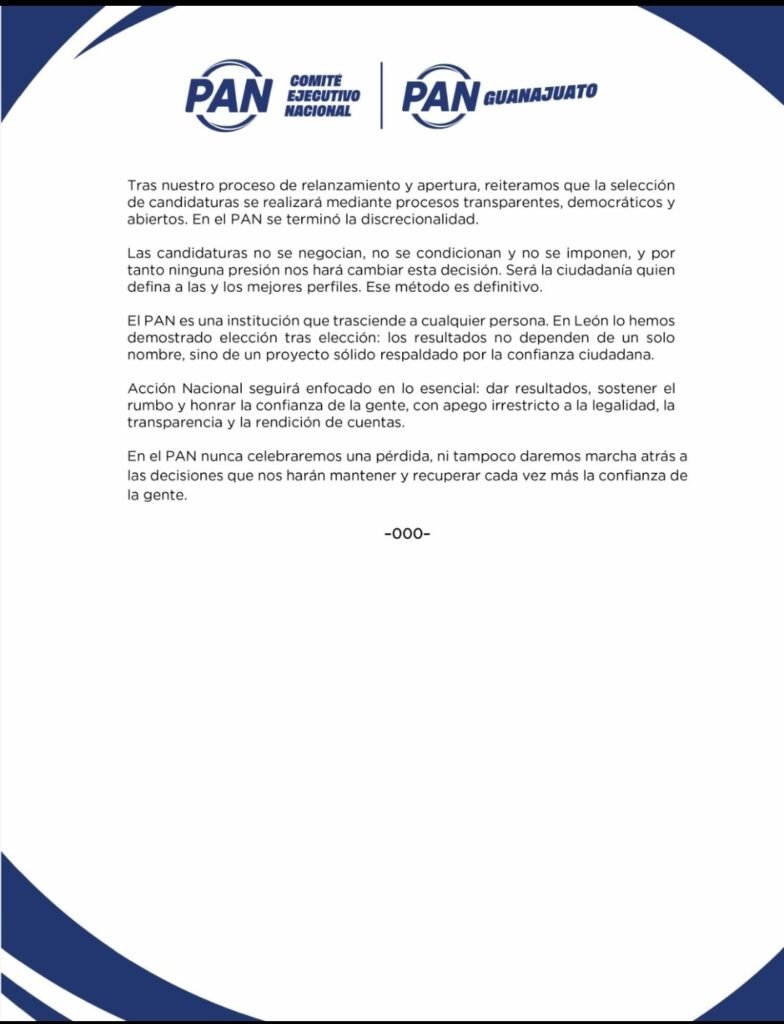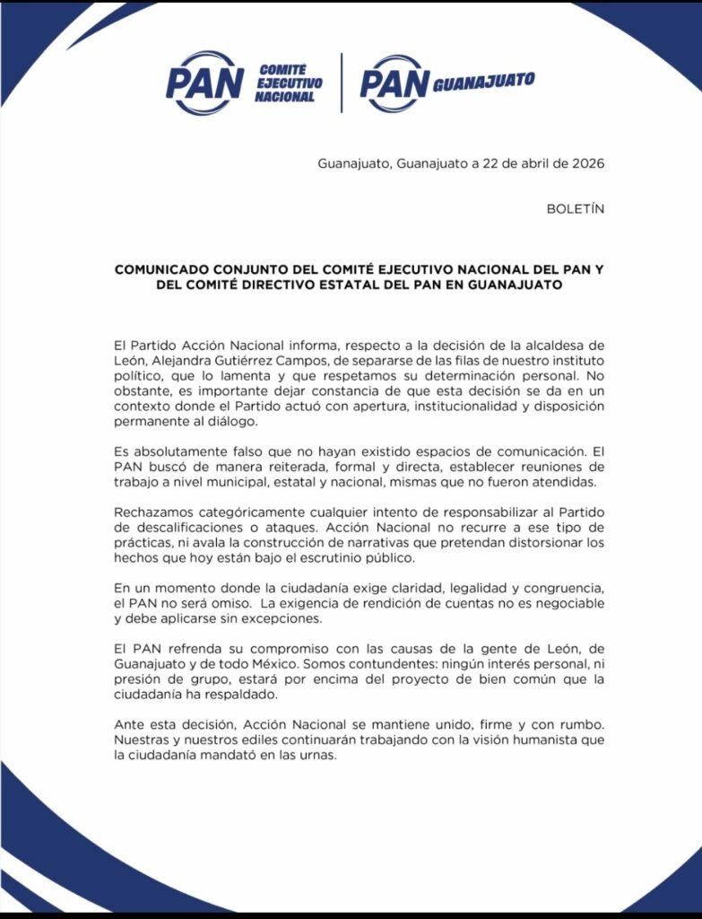 En respuesta, el dirigente estatal del PAN en Guanajuato, Aldo Márquez, rechazó las acusaciones y afirmó que la alcaldesa falta a la verdad. A través de un comunicado conjunto con la dirigencia nacional y estatal, el partido sostuvo que siempre existió apertura al diálogo y disposición para atender cualquier inconformidad.