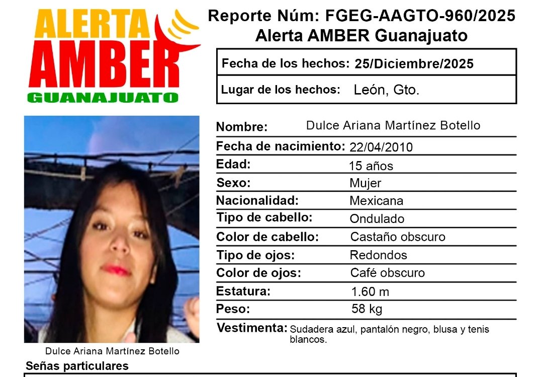Se activó la ficha de búsqueda de Alerta Amber Guanajuato por la adolescente Dulce Ariana Martínez Botello desaparecida en la ciudad de León.