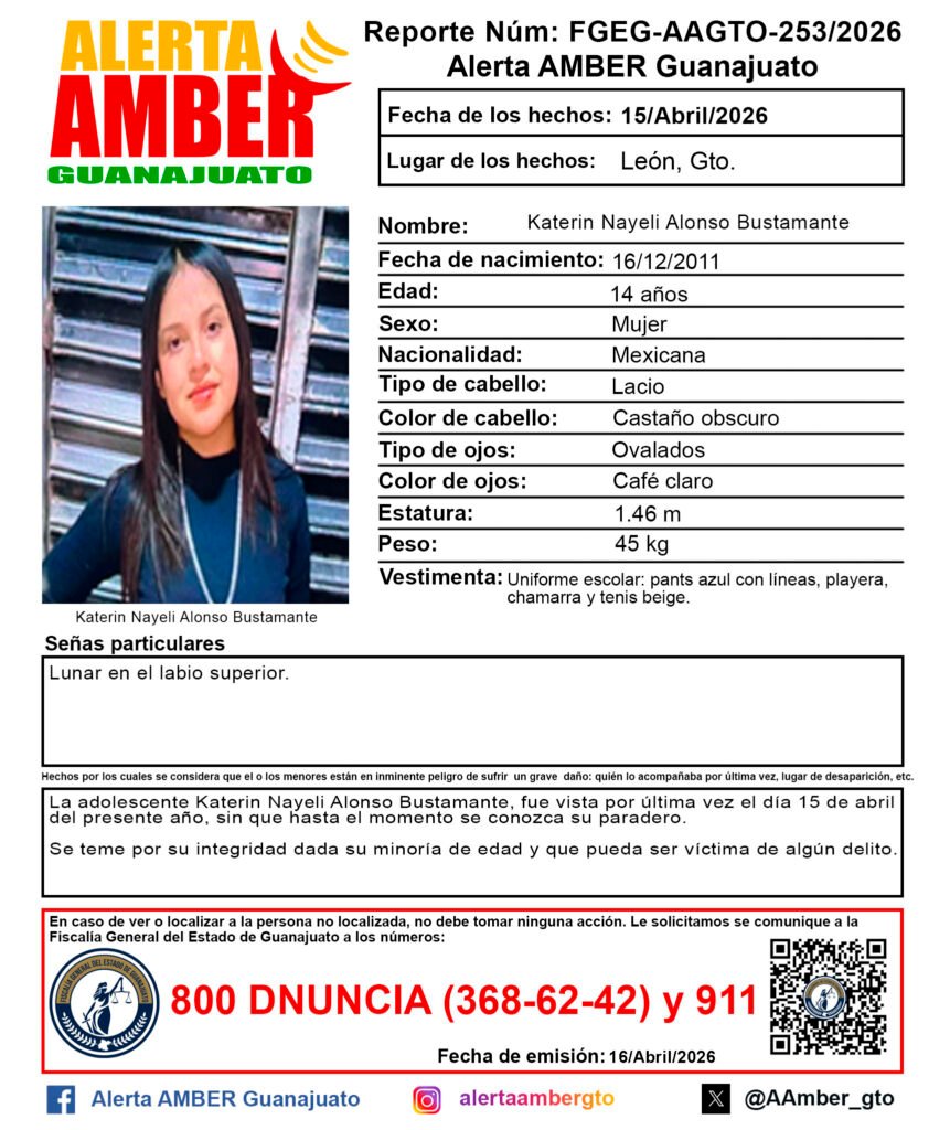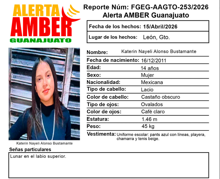La adolescente Karetin Nayeli Alonso Bustamante de 14 años de edad, se reportó como desaparecida en León el día 15 de abril del año en curso, por lo que se activó una ficha de búsqueda de Alerta Amber Guanajuato.