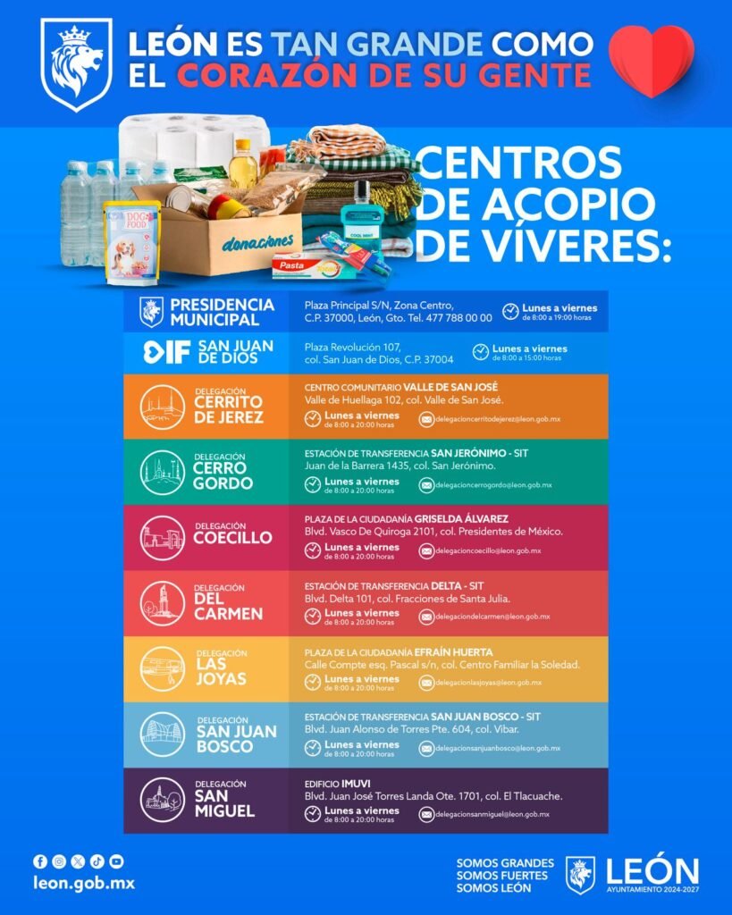 De igual manera, el DIF León dispuso 39 centros de acopio para que las y los ciudadanos que deseen sumarse, pueden llevar artículos en horario de 8:00 a 15:00 horas.