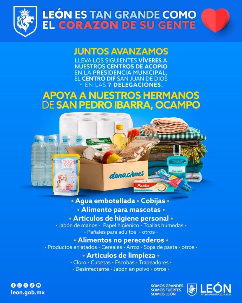 “Queremos brindarte las instalaciones del Municipio de León para que puedan servir como centros de acopio, tú puedes hacer la diferencia, llevar artículos de primera necesidad y ayudar a nuestros hermanos de Ocampo” , expresó.
