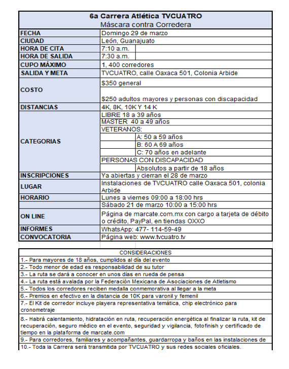 Finalmente, apuntó que los resultados del tiempo de chip de la competencia se publicarán el mismo domingo 29 de marzo de 2026, a partir de las 4:00 p.m. en www.marcate.com.mx donde podrán consultarse e imprimirse.